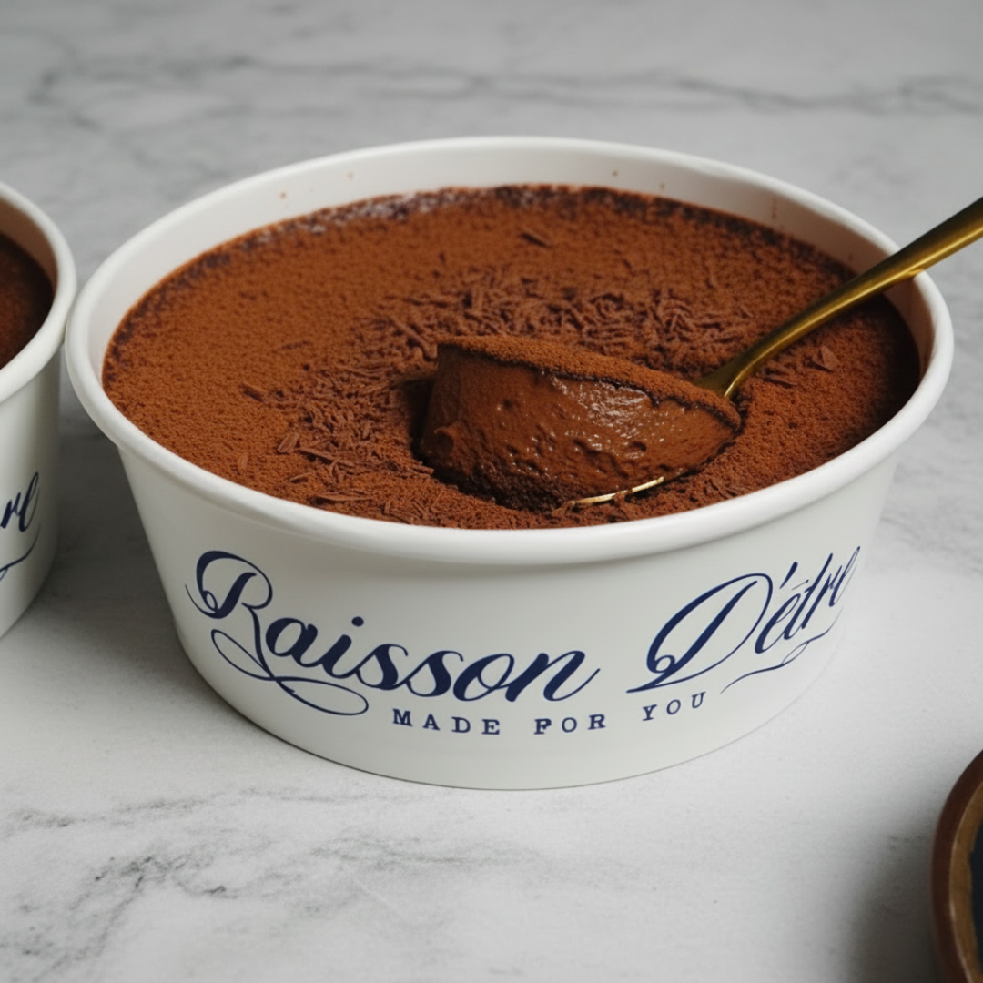 Freshly baked dark african cocoa pound tiffin cake, topped with a velvety 70% couverture belgian chocolate custard and a dusting of cocoa powder.