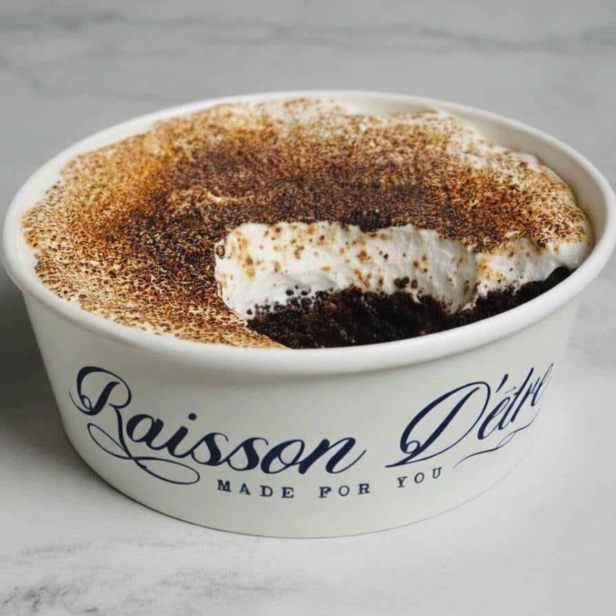 Freshly baked, dark African cacao pound cake, soaked in filter coffee tres leches (three milks). Topped with mascarpone cream and a dusting of coffee.