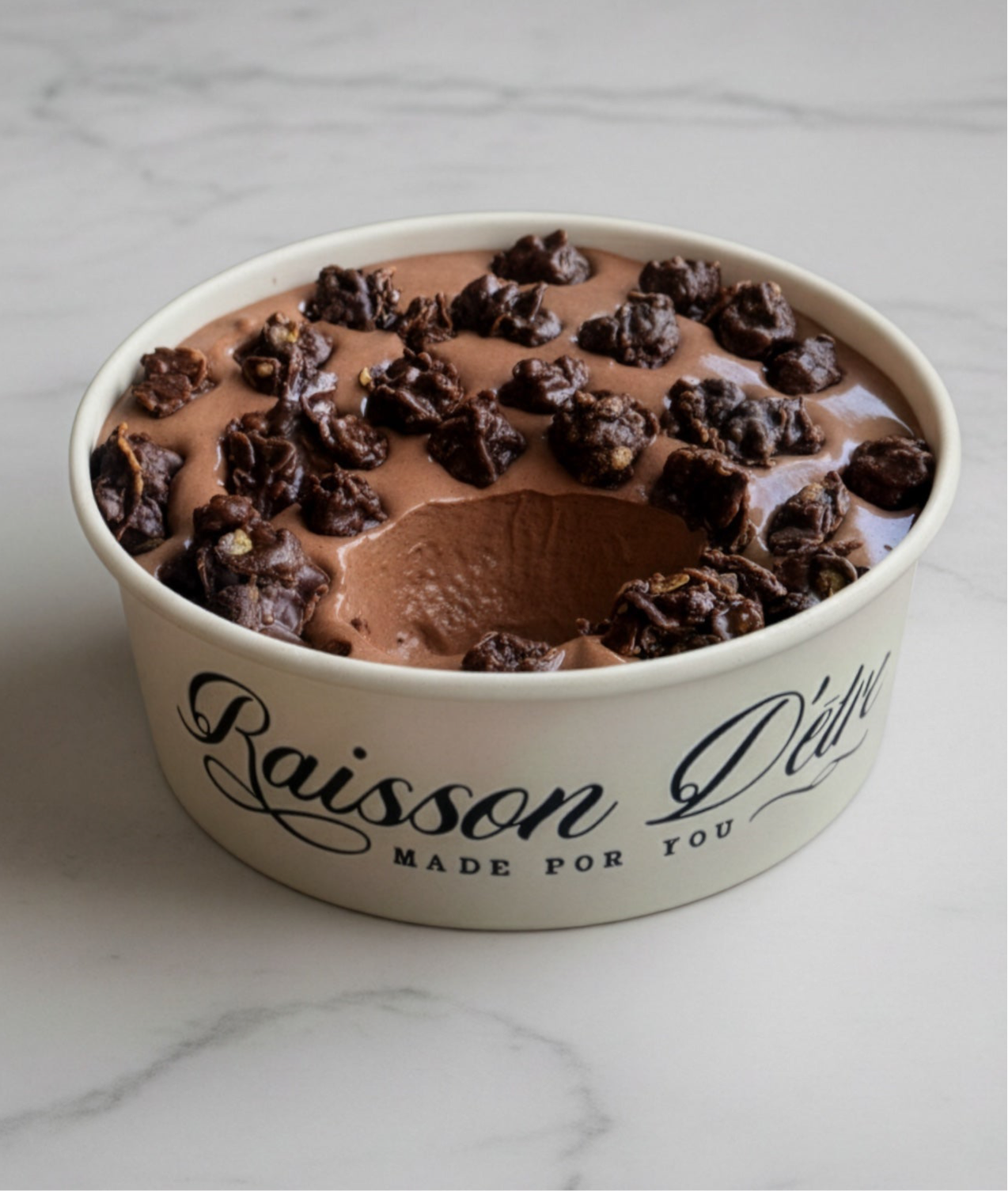Freshly baked, dark, African tiffin pound cake, topped with a nutella mousse and a cornflake and toasted hazelnut chocolate crunch.
