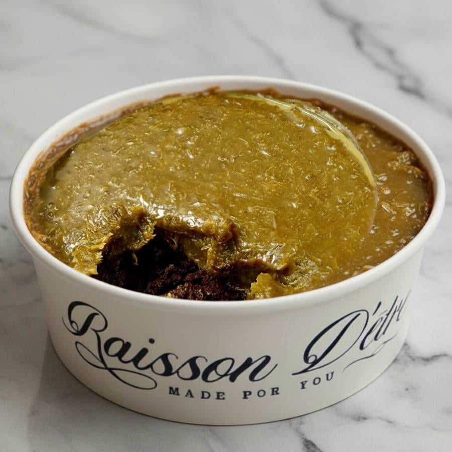 Dark cacao pound cake, soaked in pistachio milk, topped with pistachio and butter toasted kunafa.