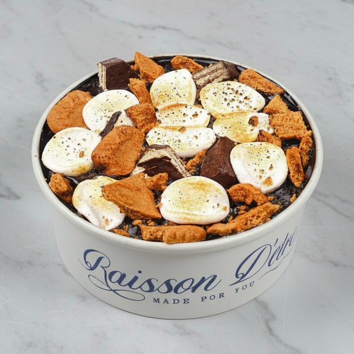 Chocolate pound tiffin cake topped with lotus biscoff spread and followed by chocolate ganache. Decorated with bruleed marshmallow and lotus biscoff cookies.