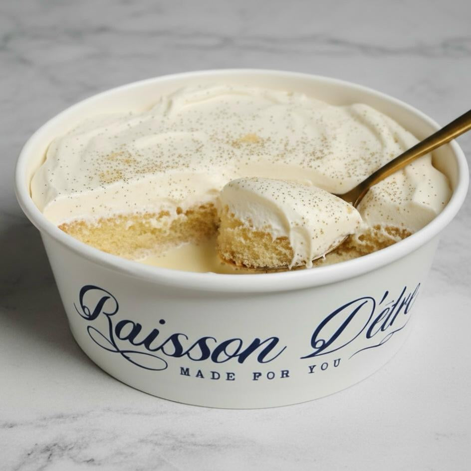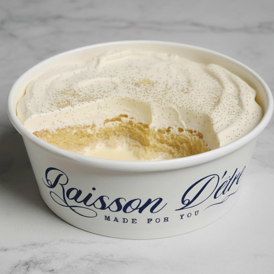 Vanilla cake soaked with Madagascar vanilla three milk and topped with fresh vanilla bean cream and cinnamon.